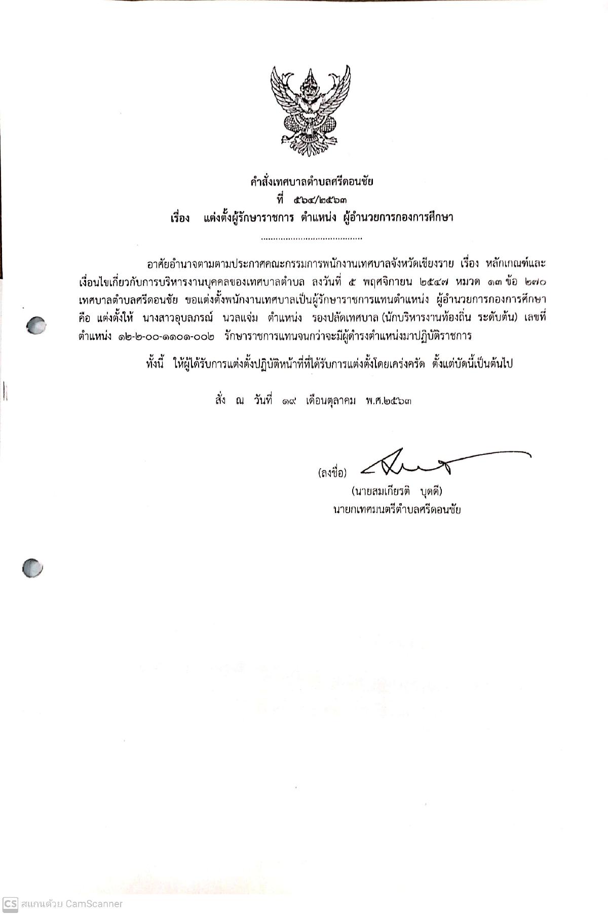 แต่งตั้งผู้รักษาราชการ ตำแหน่ง ผู้อำนวยการกองการศึกษา