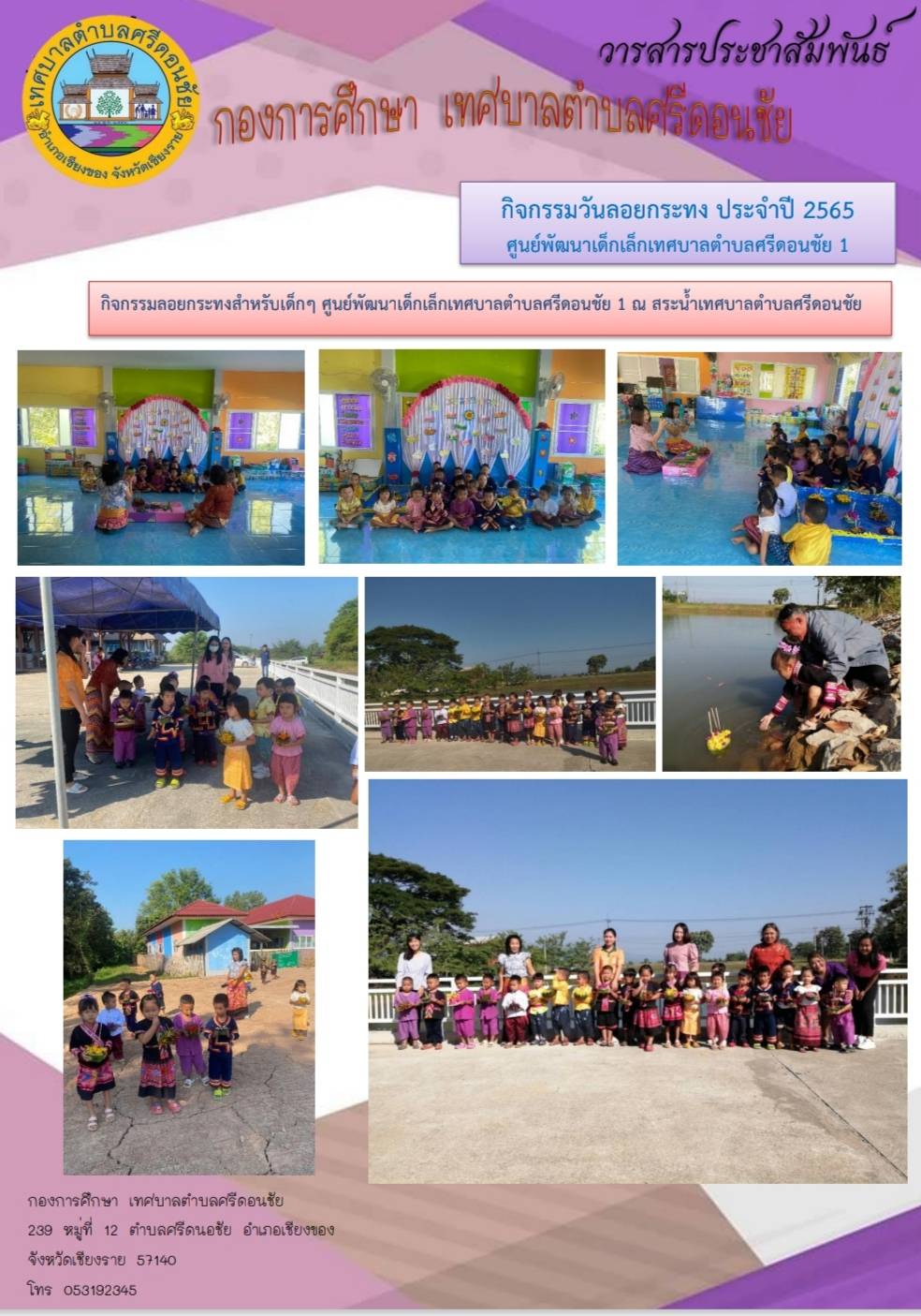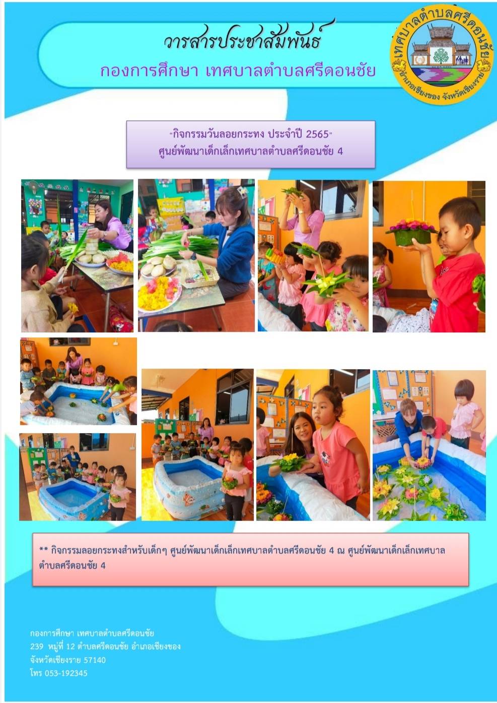 เมื่อวันที่ 8 พฤศจิกายน 2565 ศูนย์พัฒนาเด็กเล็กเทศบาลตำบลศรีดอนชัย ได้จัดกิจกรรมวันลอยระทง ประจำปี 2565 สำหรับเด็กเล็ก ของศูนย์พัฒนาเด็กเล็กในสังกัดเทศบาลตำบลศรีดอนชัย เพื่อเป็นการสืบสานประเพณีอันดีงามของไทย