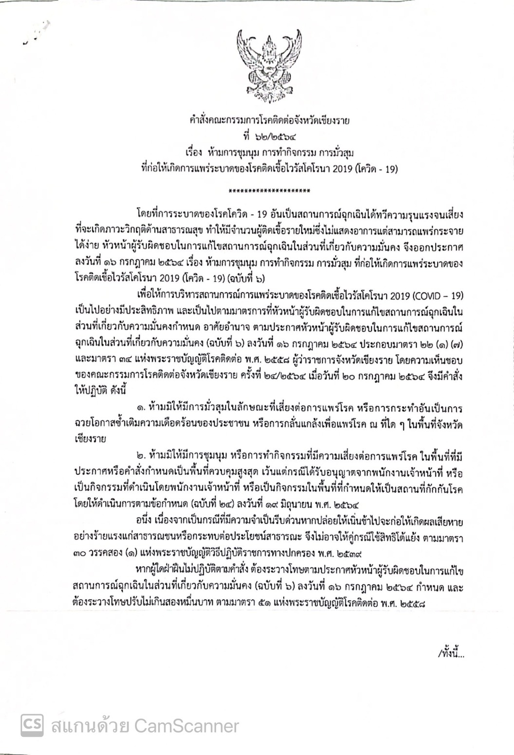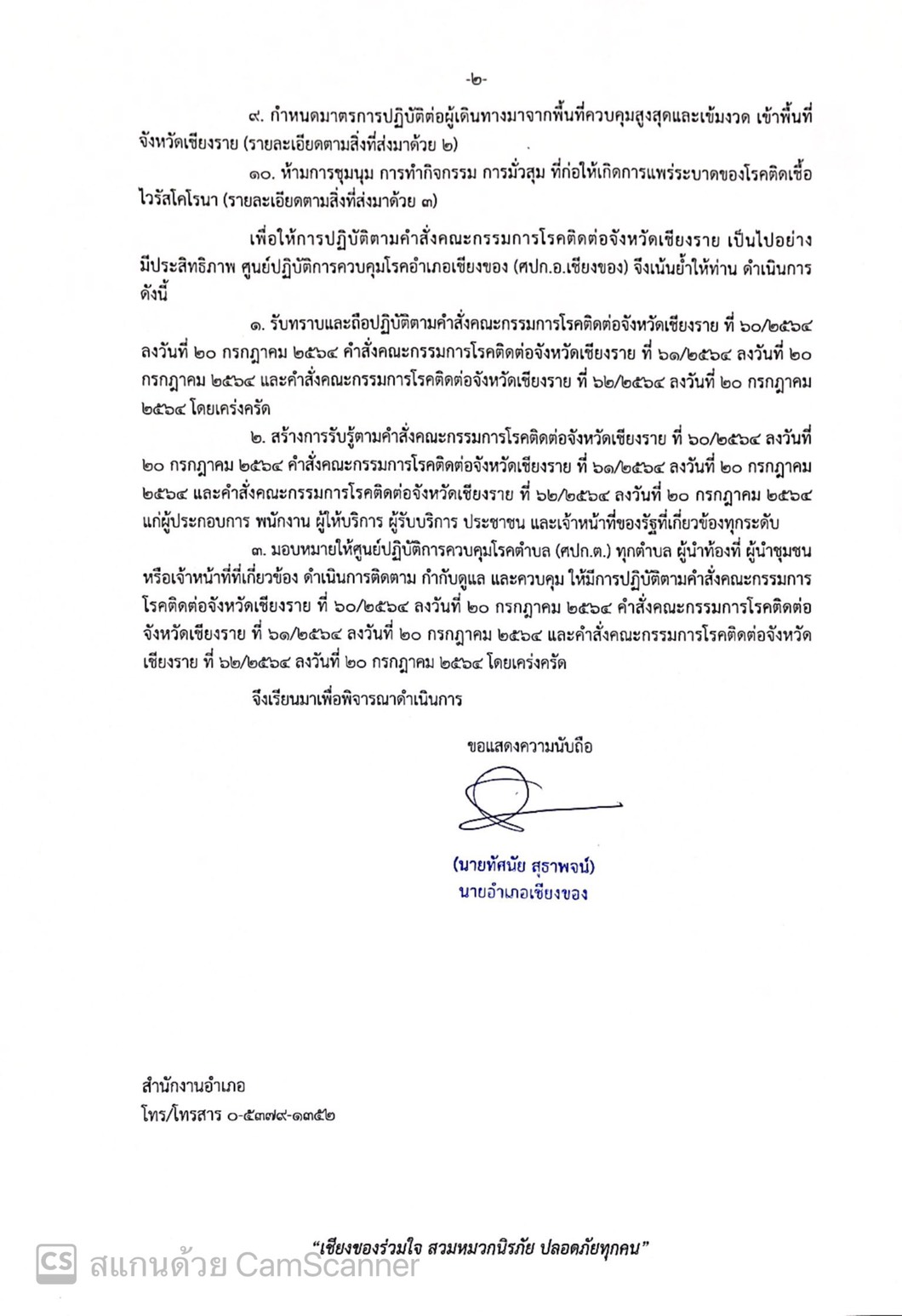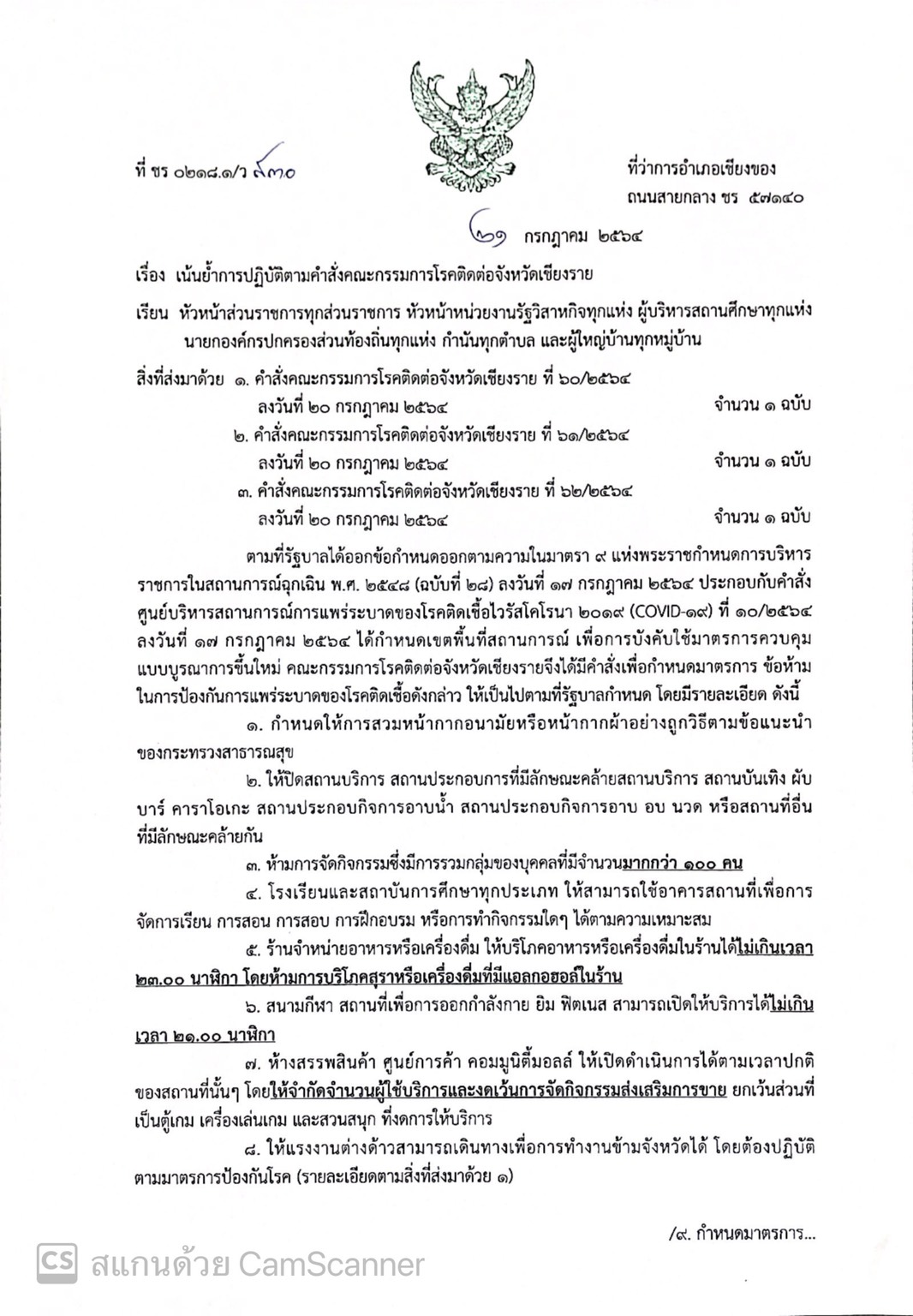เน้นย้ำการปฏิบัติตามคำสั่งคณะกรรมการโรคติดต่อจังหวัดเชียงราย