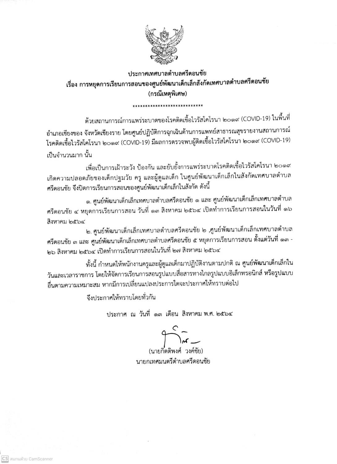ประกาศเทศบาลตำบลศรีดอนชัย เรื่อง การหยุดเรียนการสอนของศูนย์พัฒนาเด็กเล็กเทศบาลตำบลศรีดอนชัย (กรณีพิเศษ)