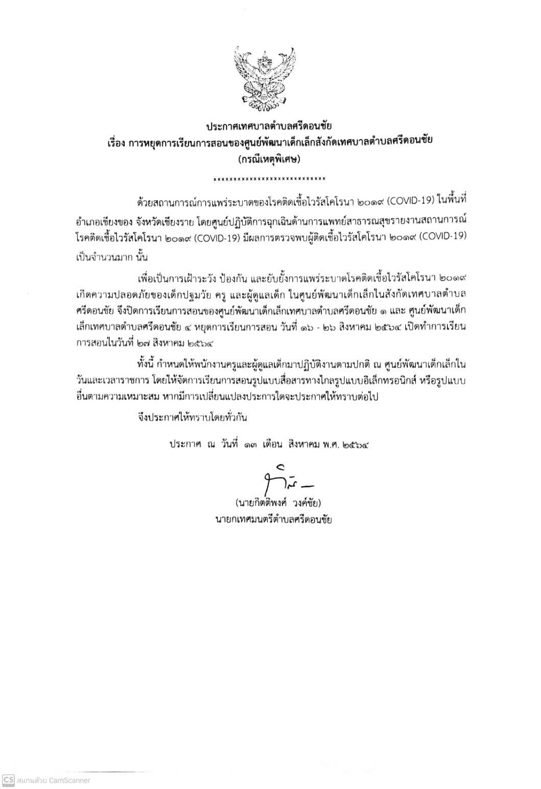 ประกาศเทศบาลตำบลศรีดอนชัย เรื่อง การหยุดเรียนการสอนของศูนย์พัฒนาเด็กเล็กเทศบาลตำบลศรีดอนชัย (กรณีพิเศษ)