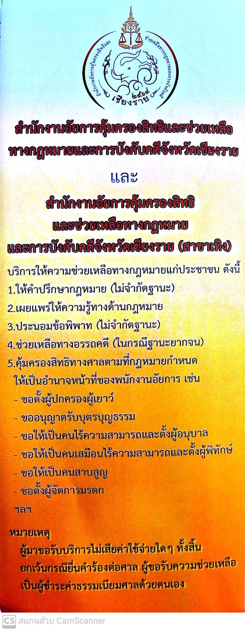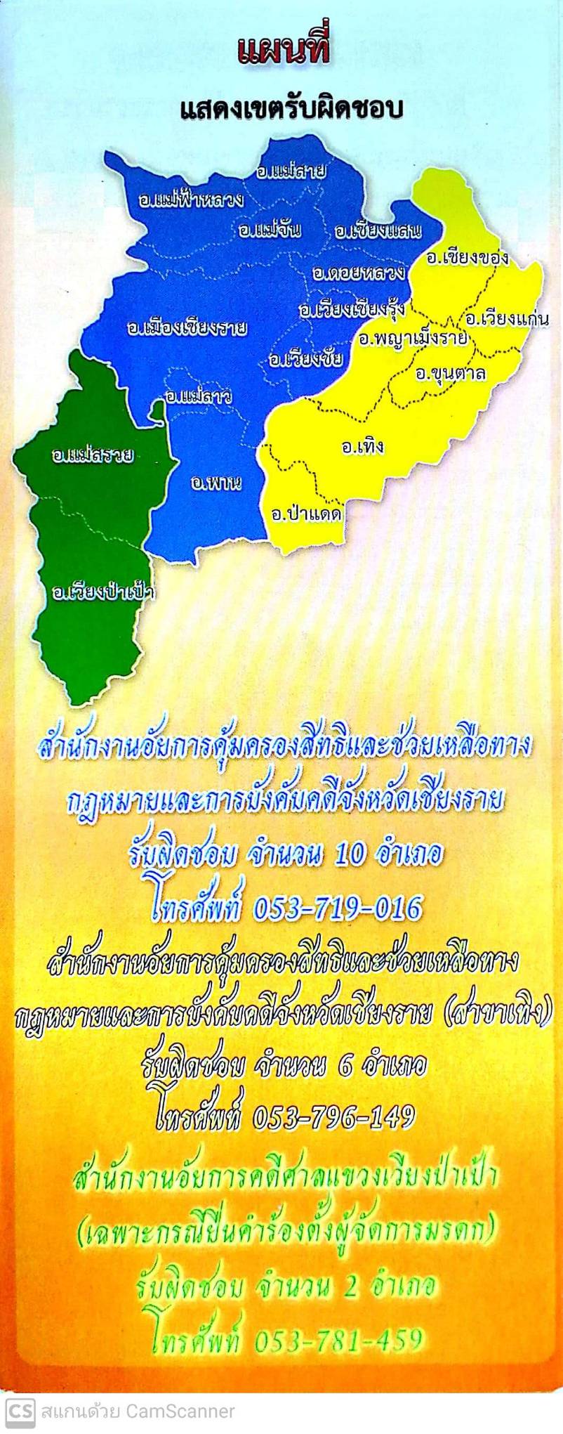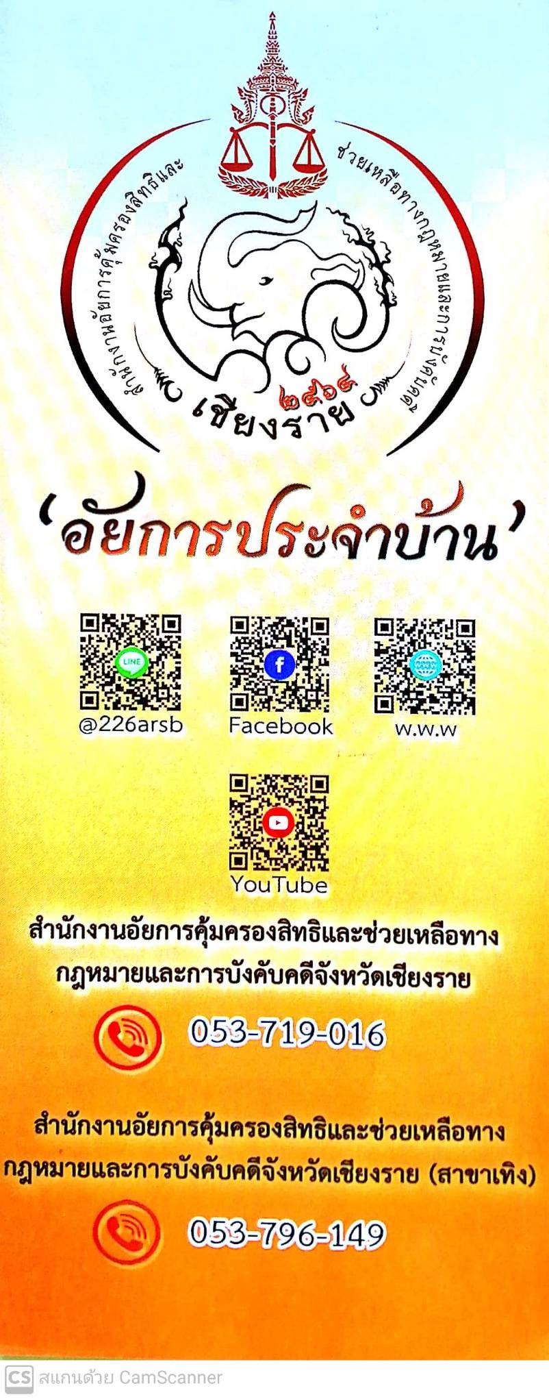 ด้วยสำนักงานอัยการคุ้มครองสิทธิและช่วยเหลือทางกฎหมายและการบังคับคดีจังหวัดเชียงราย มีภารกิจในการคุ้มครองสิทธิตามกฎหมายที่กำหนดให้เป็นอำนาจหน้าที่ของพนักงานอัยการ การให้ความช่วยเหลือทางกฎหมายด้วยการให้คำปรึกษา การไกล่เกลี่ยข้อพิพาทในทางแพ่งและทางอาญา การให้ความช่วยเหลือทางอรรถคดีด้วยการว่าต่างและแก้ต่างคดีแพ่งหรือคดีอาญา การจัดทำคำร้องขอค่าสินไหมทดแทนในคดีอาญาที่พนักงานอัยการเป็นโจทก์ การบังคับคดีตามสัญญาประนีประนอมยอมความที่กำหนดให้เป็นอำนาจหน้าที่ของพนักงานอัยการ การอบรม เผยแพร่ความรู้ทางกฎหมาย แก่บุคลากรและประชาชน ในการนี้เห็นว่า องค์กรปกครองส่วนท้องถิ่น มีบทบาท หน้าที่ในการให้ความช่วยเหลือแก่ประชาชนทางกฎหมายอย่างใกล้ชิด