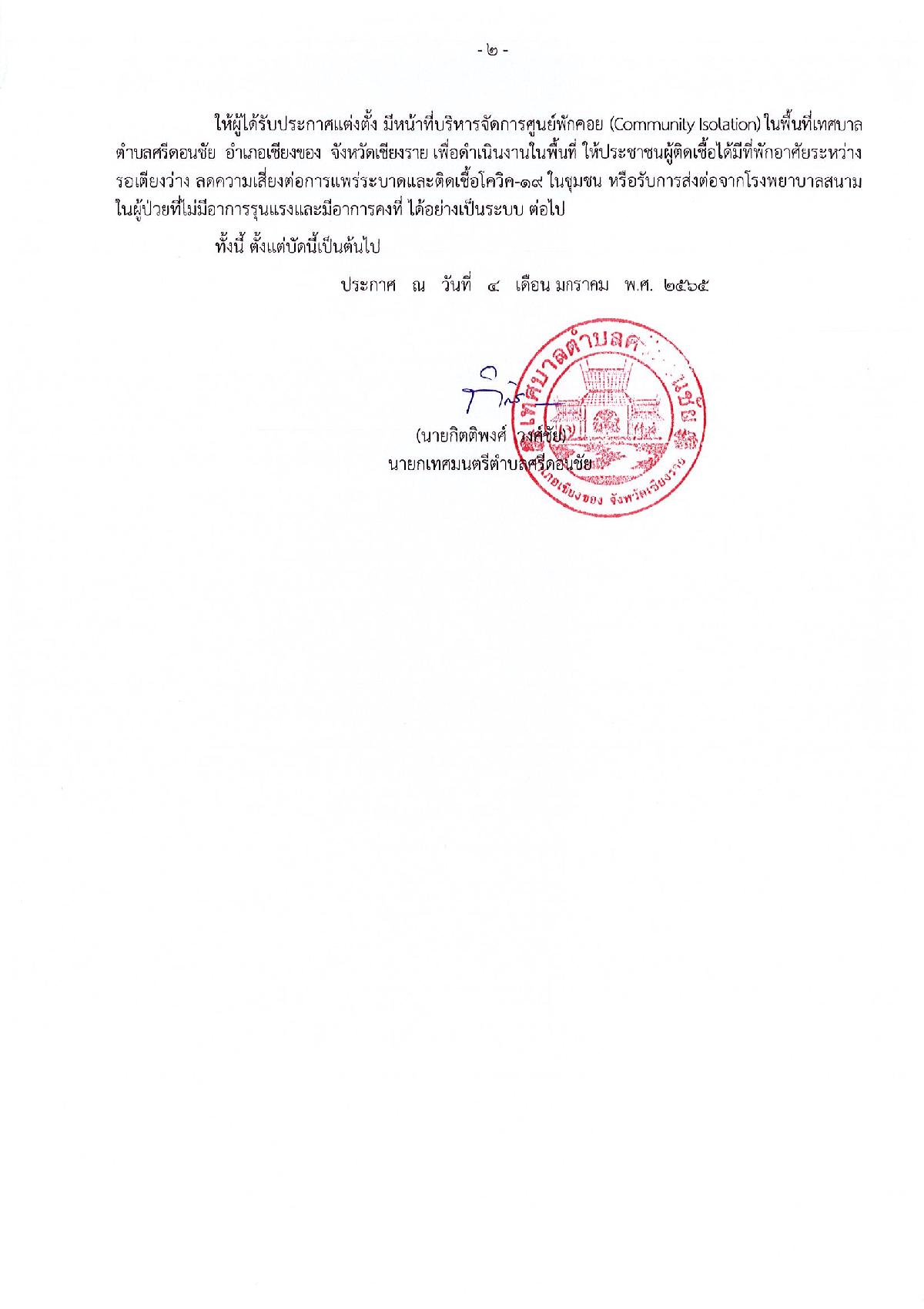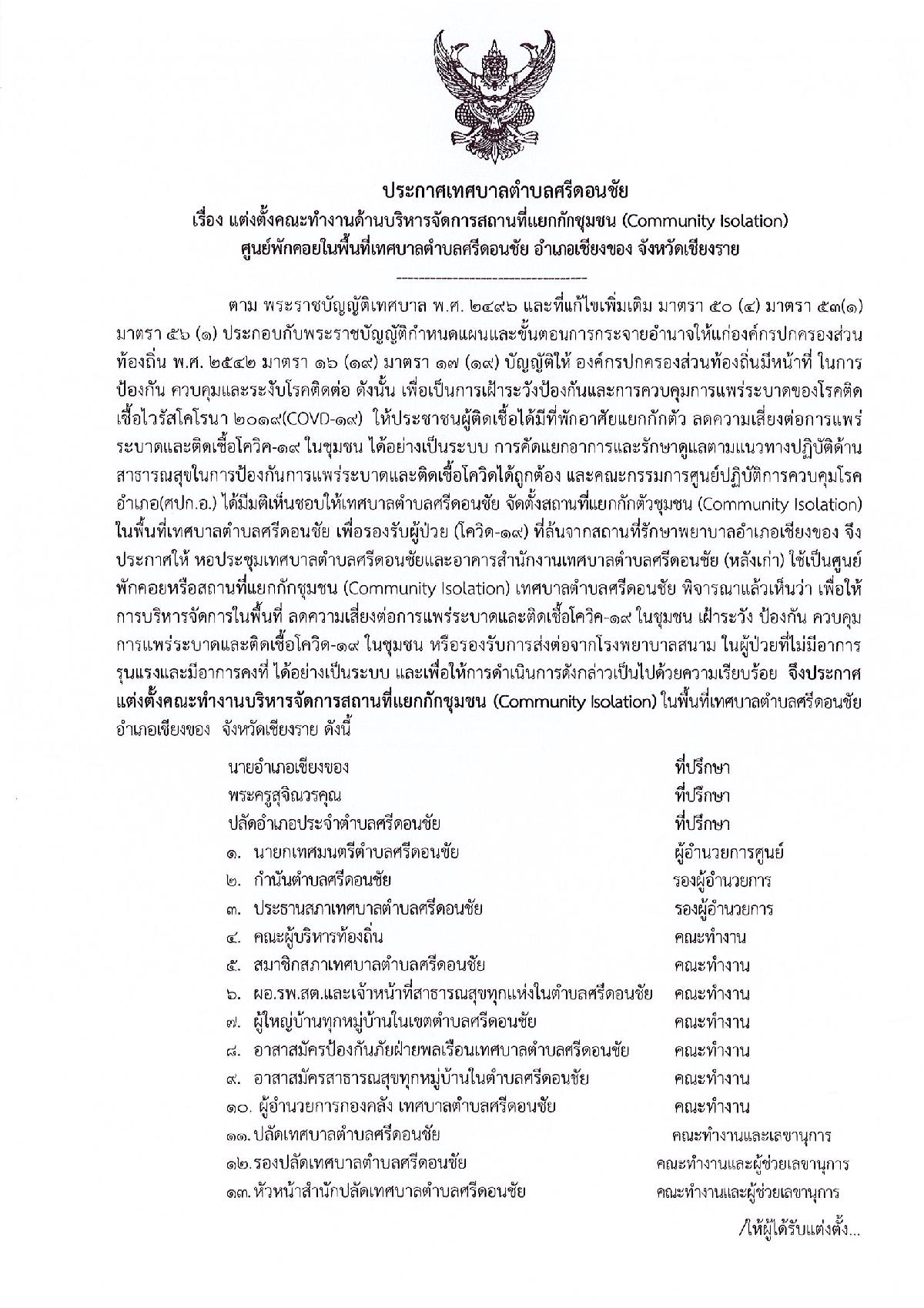 ประกาศเทศบาลตำบลศรีดอนชัย เรื่อง จัดตั้งศูนย์พักคอยหรือกำหนดสถานที่ และแต่งตั้งคณะทำงานด้านบริหารจัดการสถานที่แยกกักตัวชุมชน (Community Isolation ( CI ) ) ในพื้นที่เทศบาลตำบลศรีดอนชัย อำเภอเชียงของ จั