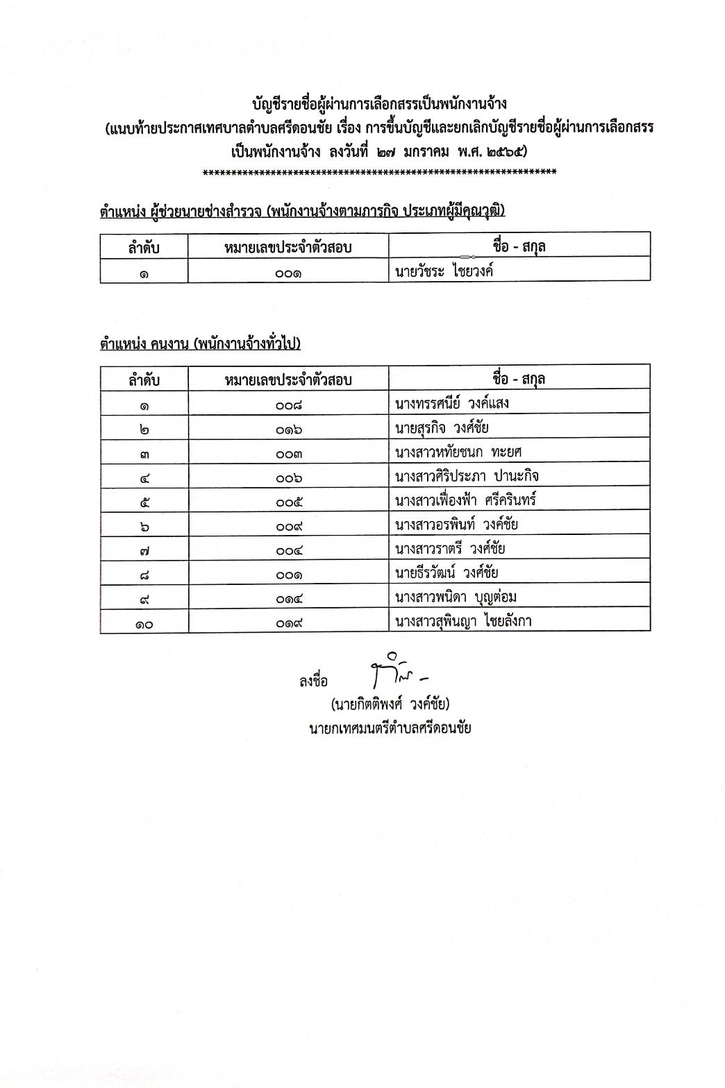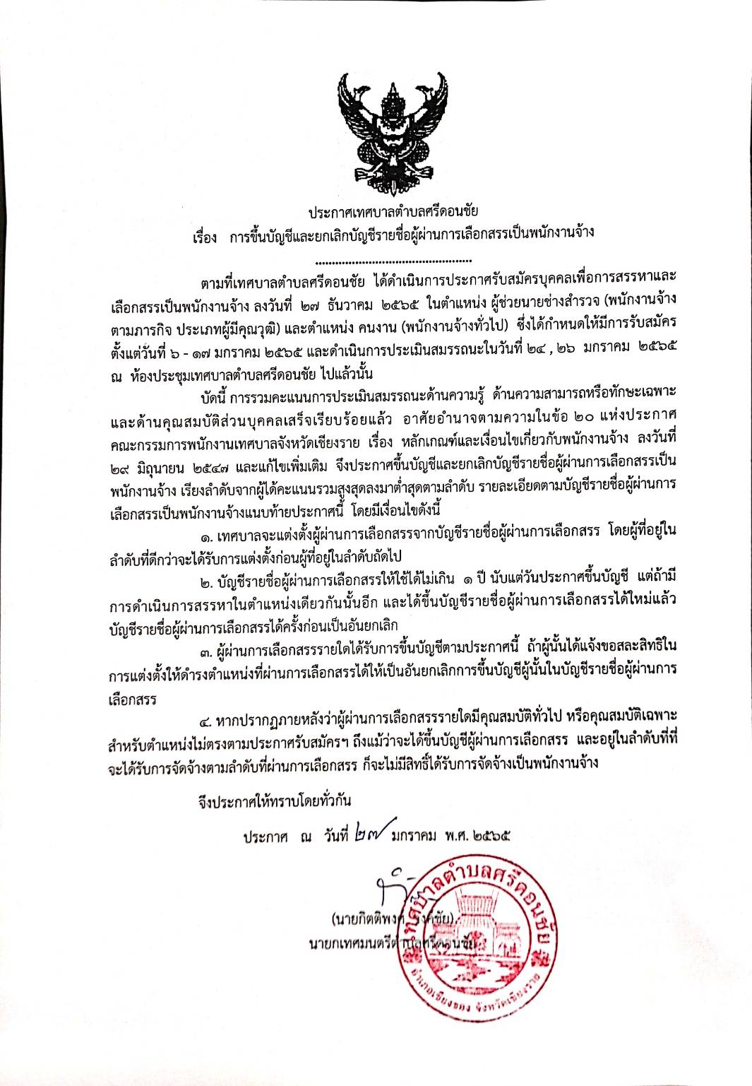 ประกาศเทศบาลตำบลศรีดอนชัย เรื่อง การขึ้นบัญชีและยกเลิกบัญชีรายชื่อผู้ผ่านการเลือกสรรเป็นพนักงานจ้าง ประกาศ ณ วันที่ 27 มกราคม 2565
