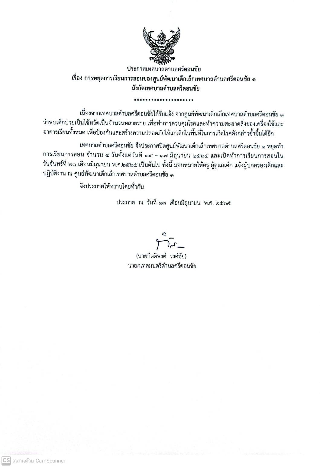 ประกาศเทศบาลตำบลศรีดอนชัย เรื่อง การหยุดการเรียนการสอนของศูนย์พัฒนาเด็กเล็กเทศบาลตำบลศรีดอนชัย 1