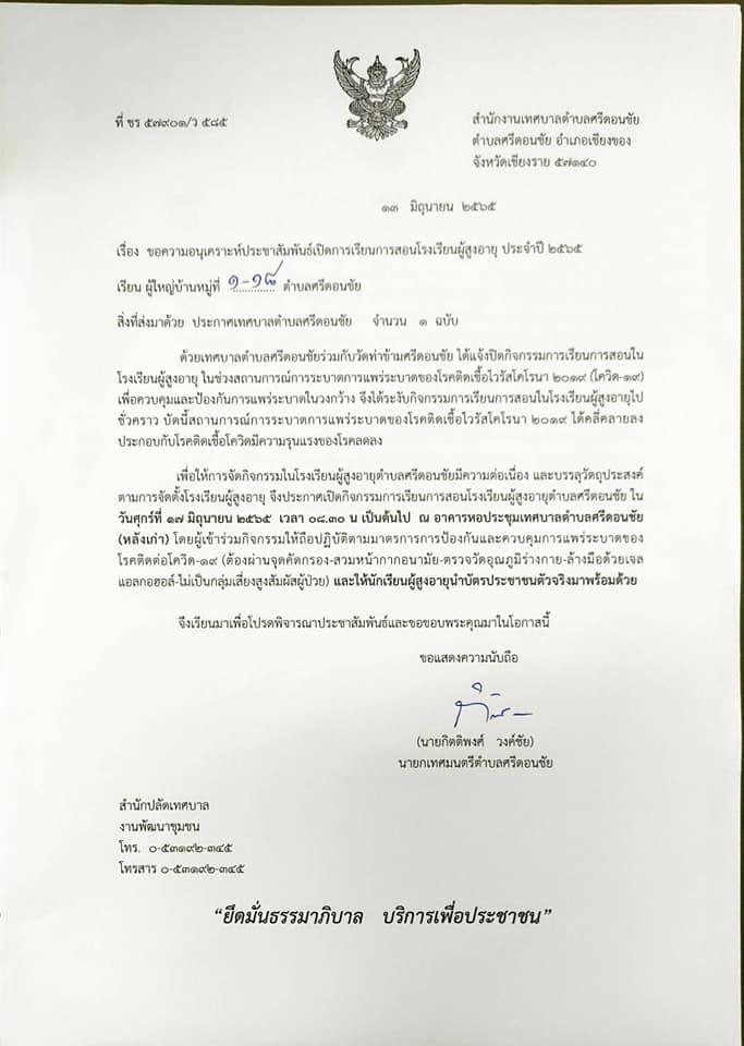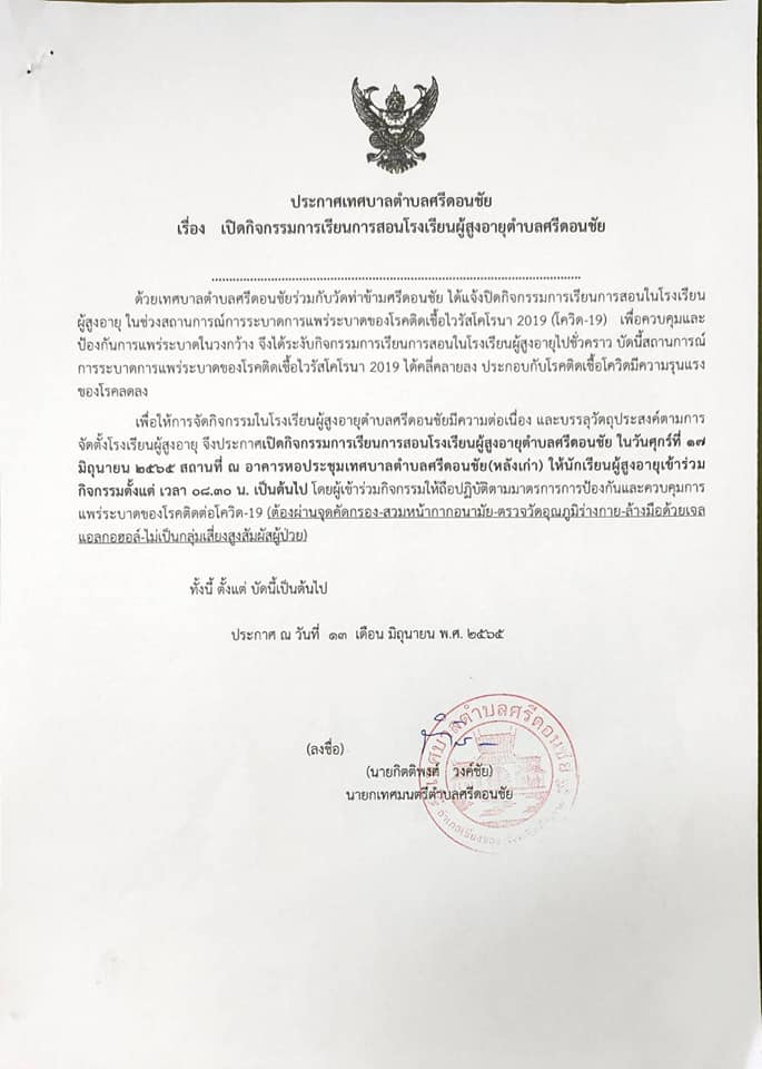 ขอความอนุเคราะห์ประชาสัมพันธ์ประกาศเปิดโรงเรียนผู้สูงอายุตำบลศรีดอนชัย ในวันศุกร์ ที่ 17 มิ.ย.65 สถานที่จัดกิจกรรม ณ หอประชุมเทศบาลตำบลศรีดอนชัย(หลังเก่า) แจ้งนักเรียนผู้สูงอายุทั้งรายใหม่รายเก่าเข้าร่วมกิจกรรม ตั้งแต่เวลา 08.30 น. เป็นต้นไป
