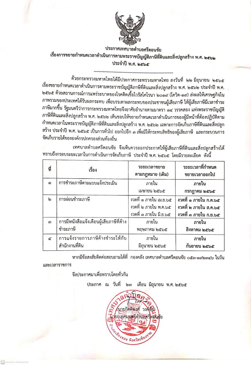 ประกาศเทศบาลตำบลศรีดอนชัย เรื่องการขยายกำหนดเวลาดำเนินการตามพระราชบัญญัติภาษีที่ดินและสิ่งปลูกสร้าง พ.ศ. 2562 ประจำปี 2563