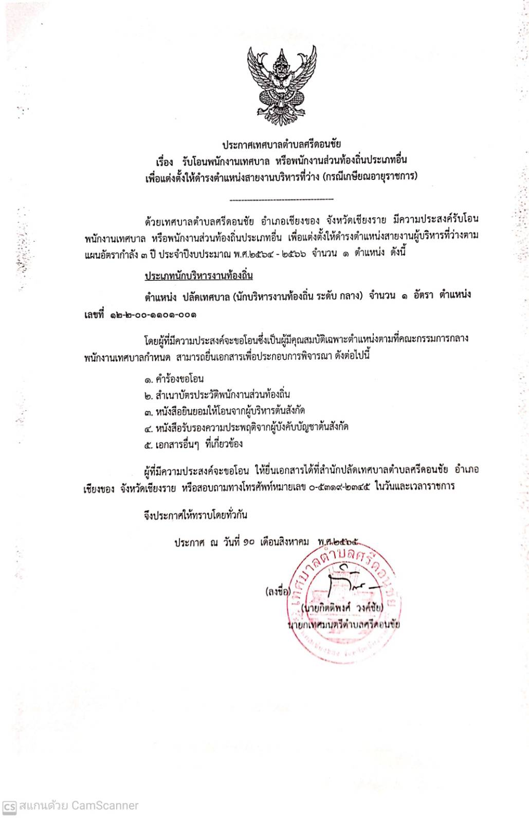 ประกาศ​เทศบาล​ตำ​บ​ลศรี​ดอน​ชัย เรื่องรับโอนพนักงานเทศบาล หรือพนักงานส่วนท้องถิ่น​ประเภทอื่น จำนวน 1 อัตรา ตำแหน่ง ปลัดเทศบาล