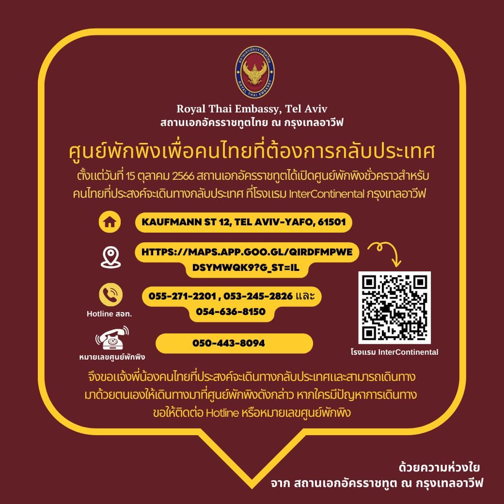 ทั้งนี้ ท่านที่ประสงค์จะเดินทางกลับ สามารถแจ้งสถานทูตฯ หรือเดินทางมายังศูนย์พักพิงได้ทันที ที่: