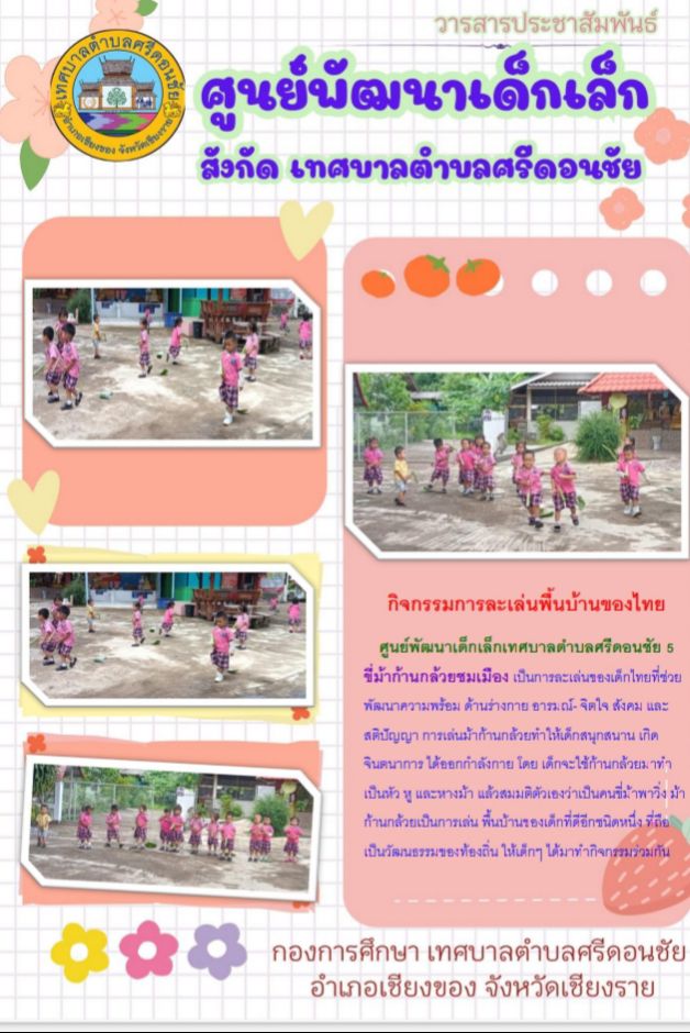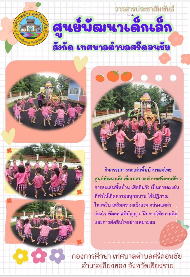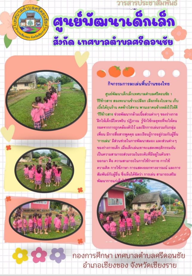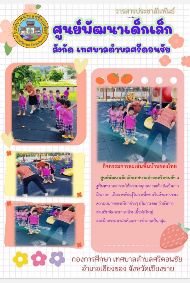 วันที่ 27 มิถุนายน 2567 ศูนย์พัฒนาเด็กเล็กในสังกัดเทศบาลตำบลศรีดอนชัย จัดกิจกรรมการละเล่นพื้นบ้านของไทย เพื่อเสริมสร้างพัฒนาการด้านต่างๆของเด็กเล็ก