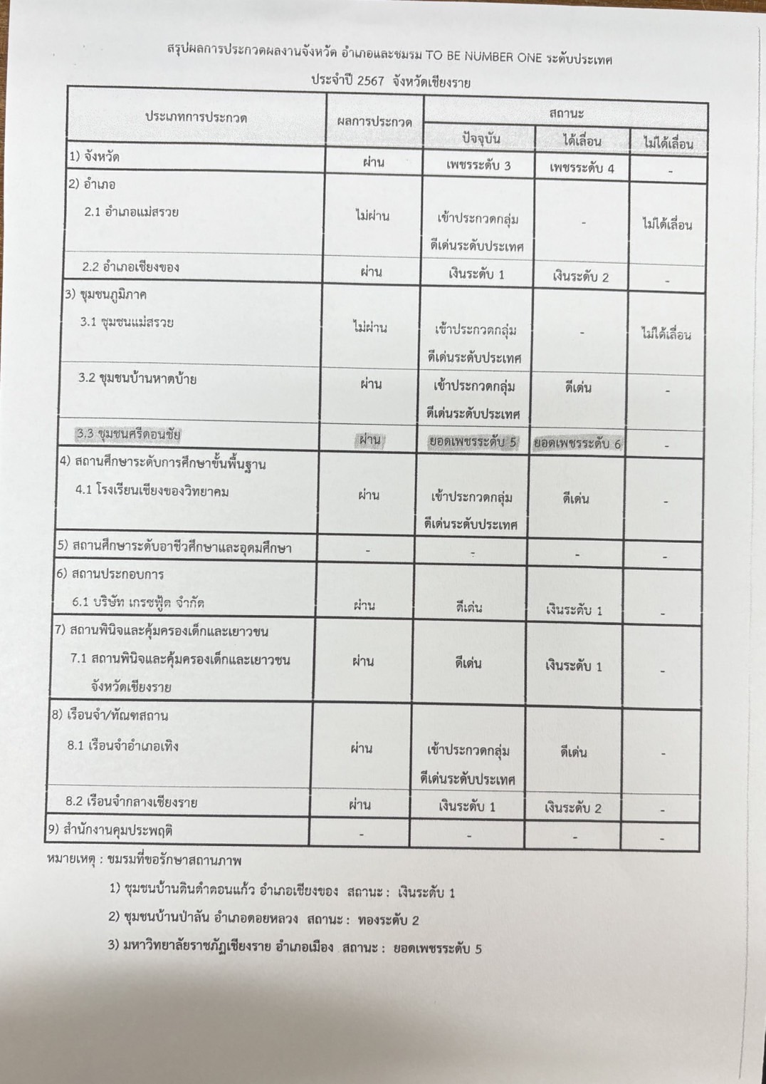 ผลการประกวดผลงานจังหวัด อำเภอและชมรม TO BE NUMBER ONE ระดับประเทศ ประจำปี 2567 จังหวัดเชียงราย