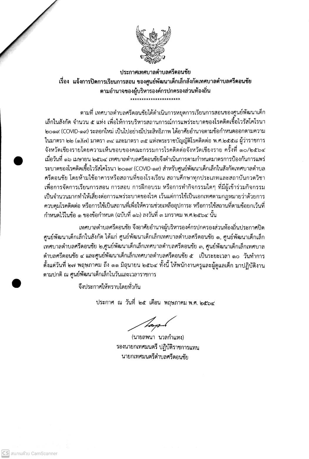 ประกาศเทศบาลตำบลศรีดอนชัย เรื่อง แจ้งการปิดการเรียนการสอนของศูนย์พัฒนาเด็กเล็กสังกัดเทศบาลตำบลศรีดอนชัย ตามอำนาจของผู้บริหารท้องถิ่น