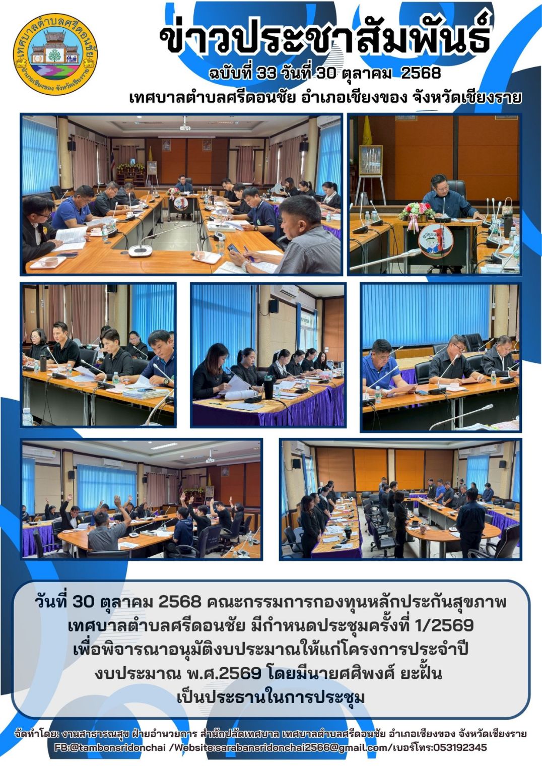 วันที่ 30 ตุลาคม 2568 คณะกรรมการกองทุนหลักประกันสุขภาพ เทศบาลตำบลศรีดอนชัย มีกำหนดประชุมครั้งที่ 1/2569 เพื่อพิจารณาอนุมัติงบประมาณให้แก่โครงการประจำปีงบประมาณ พ.ศ.2569 โดยมีนายศศิพงศ์ ยะนั้น เป็นประธานในการประชุม