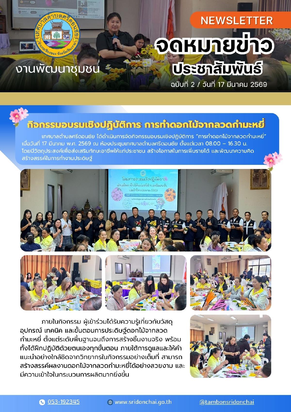 เทศบาลตำบลศรีดอนชัย ได้ดำเนินการจัดกิจกรรมอบรมเชิงปฏิบัติการ “การทำดอกไม้จากลวดกำมะหยี่” เมื่อวันที่ 17 มีนาคม พ.ศ. 2569 ณ ห้องประชุมเทศบาลตำบลศรีดอนชัย ตั้งแต่เวลา 08.00 – 16.30 น.